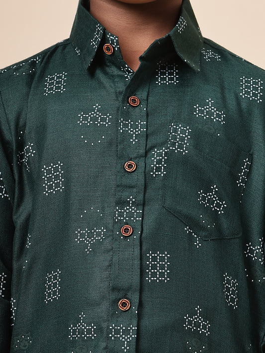 Karnam Junior - Boys Bottle Green Square Printed Cotton Shirt
