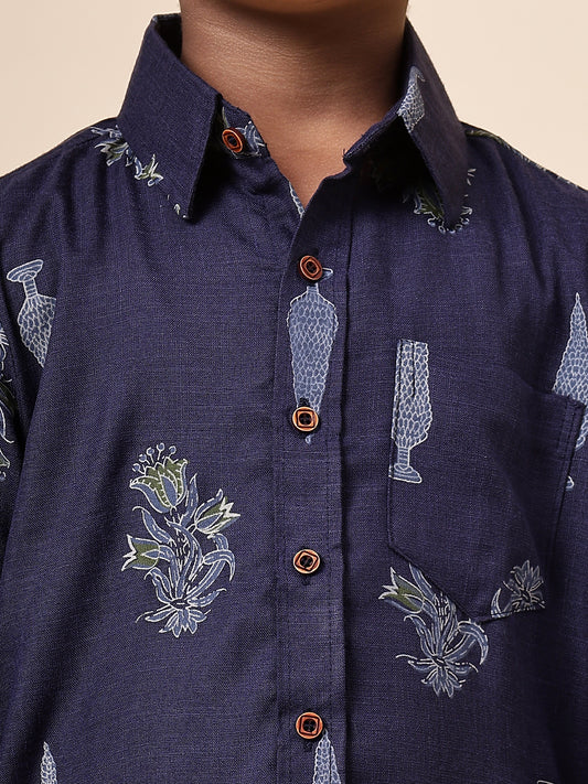 Karnam Junior - Boys Navy Blue Foliage Printed Cotton Shirt