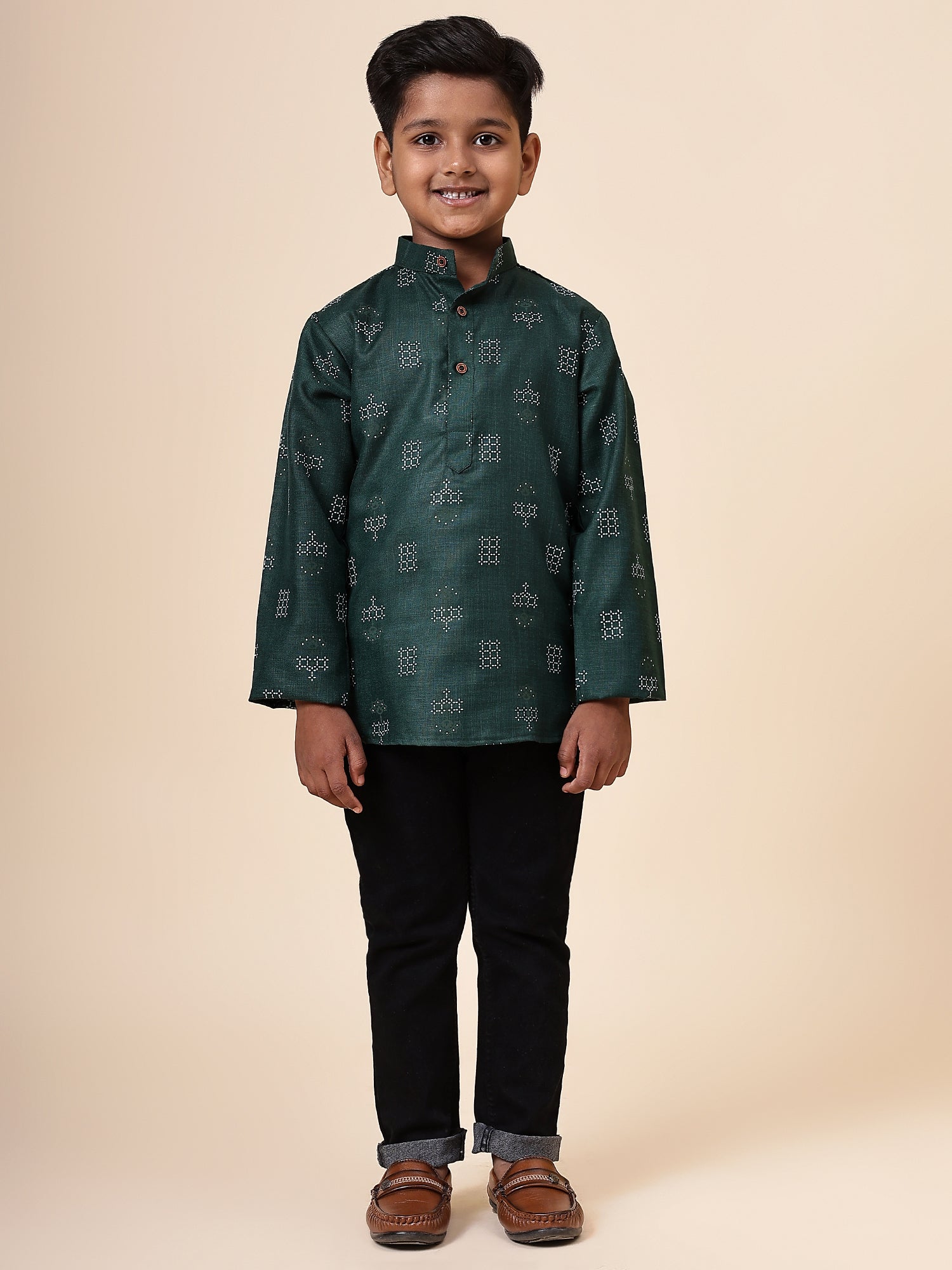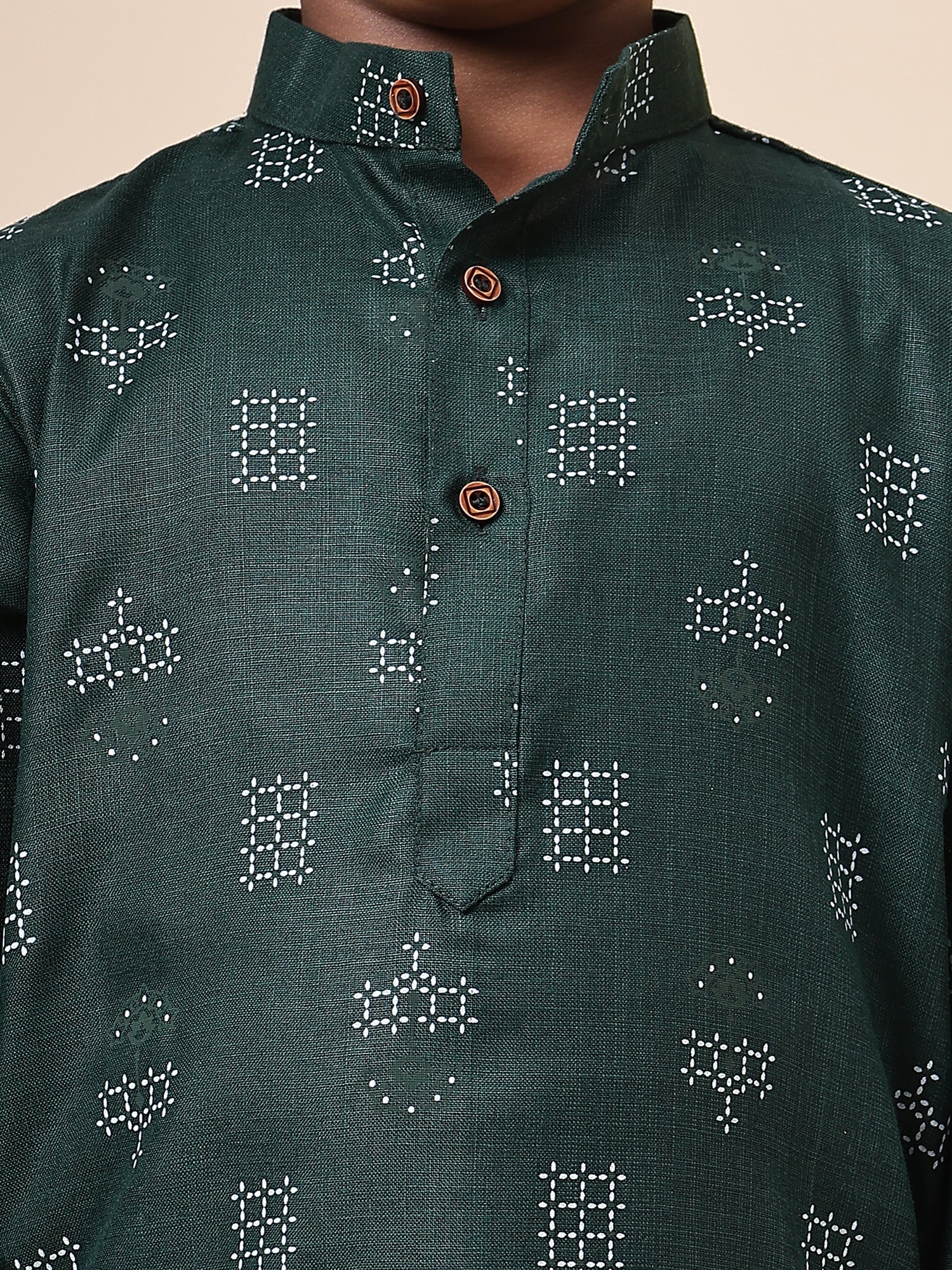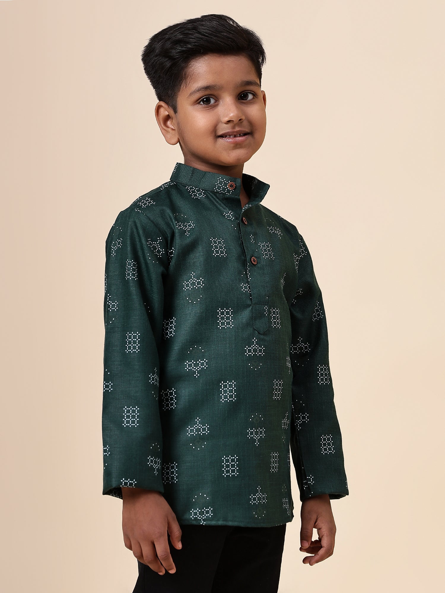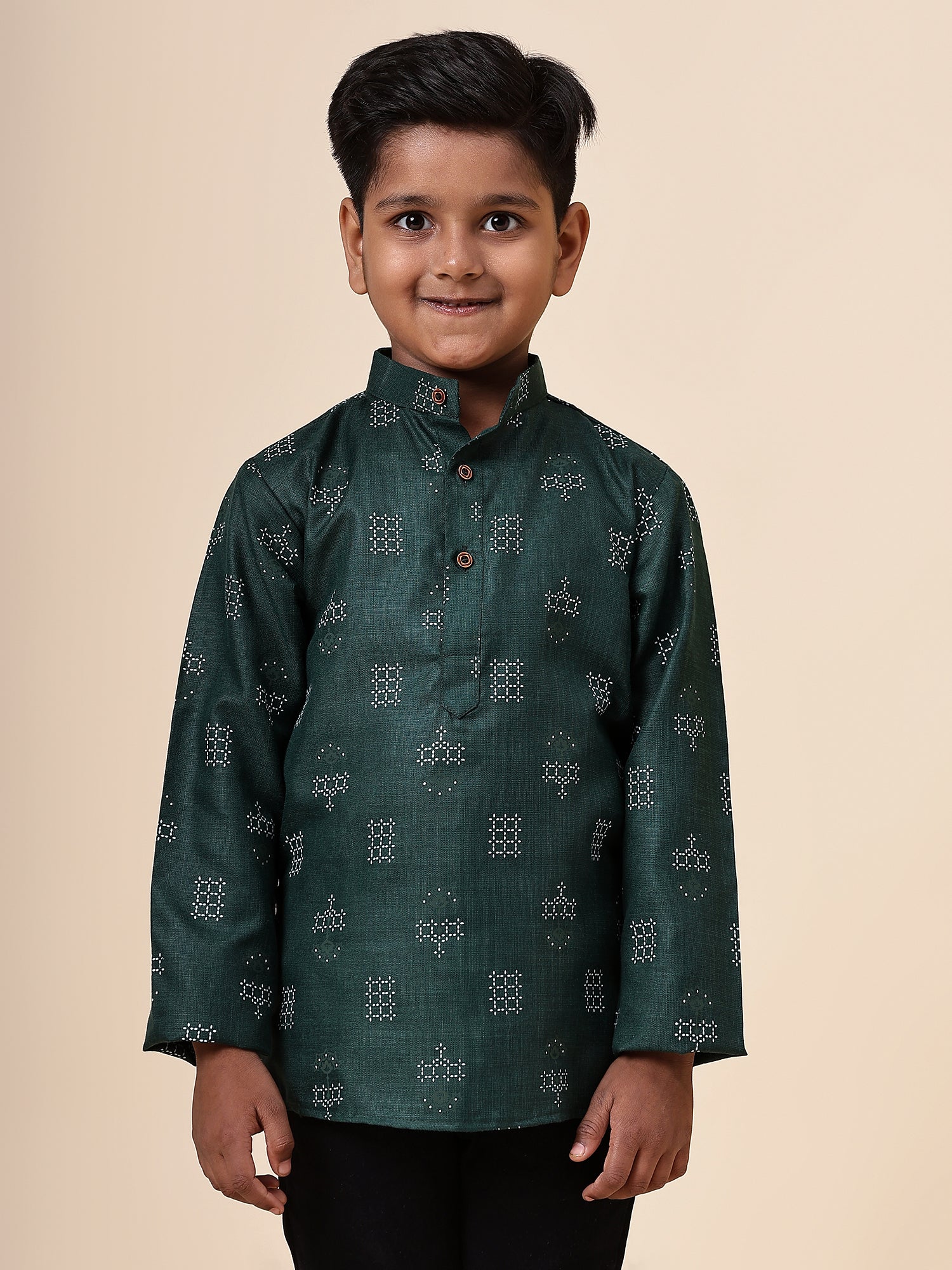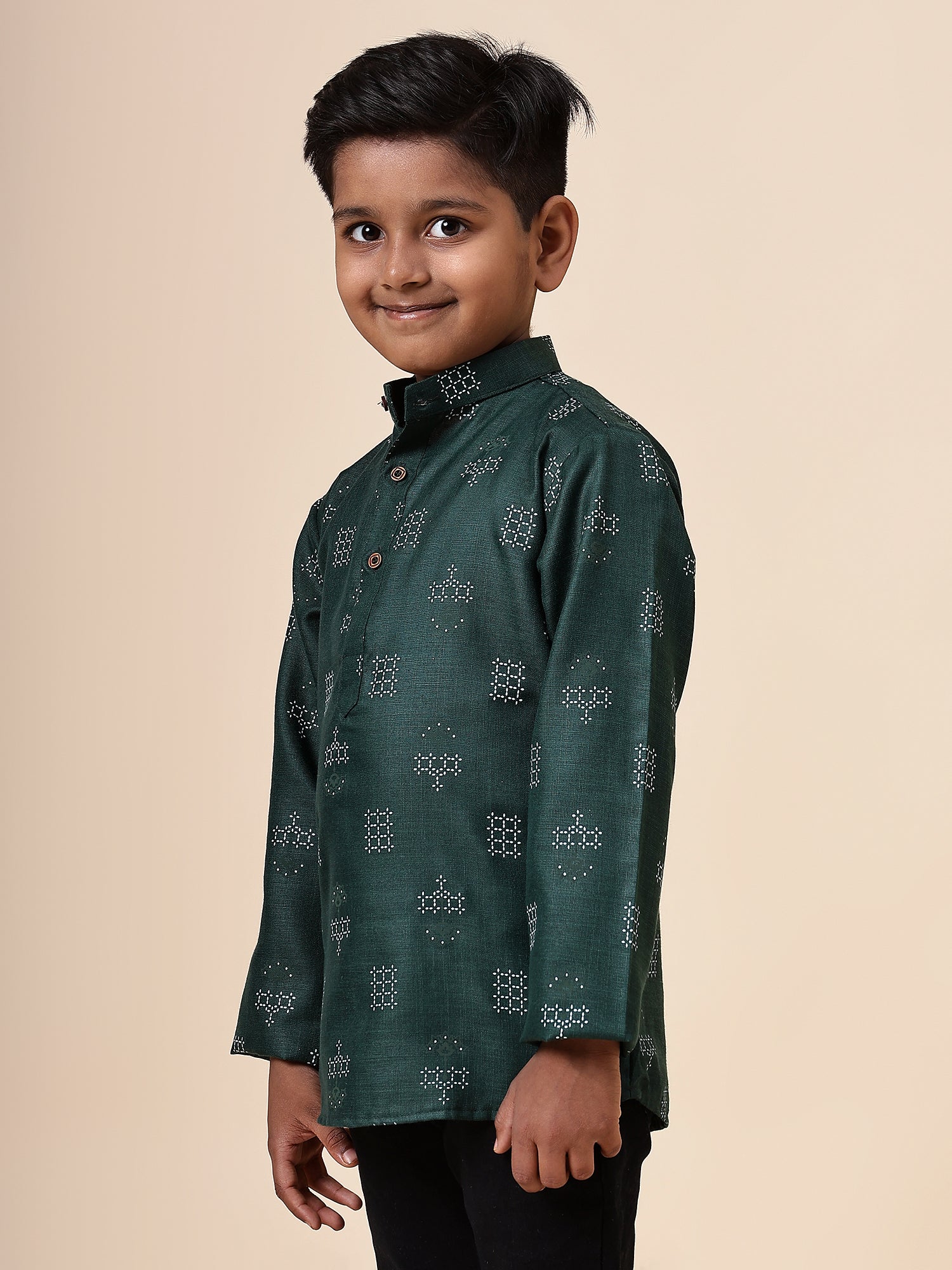 Karnam Junior - Boys Bottle Green Square Printed Cotton Short Kurta