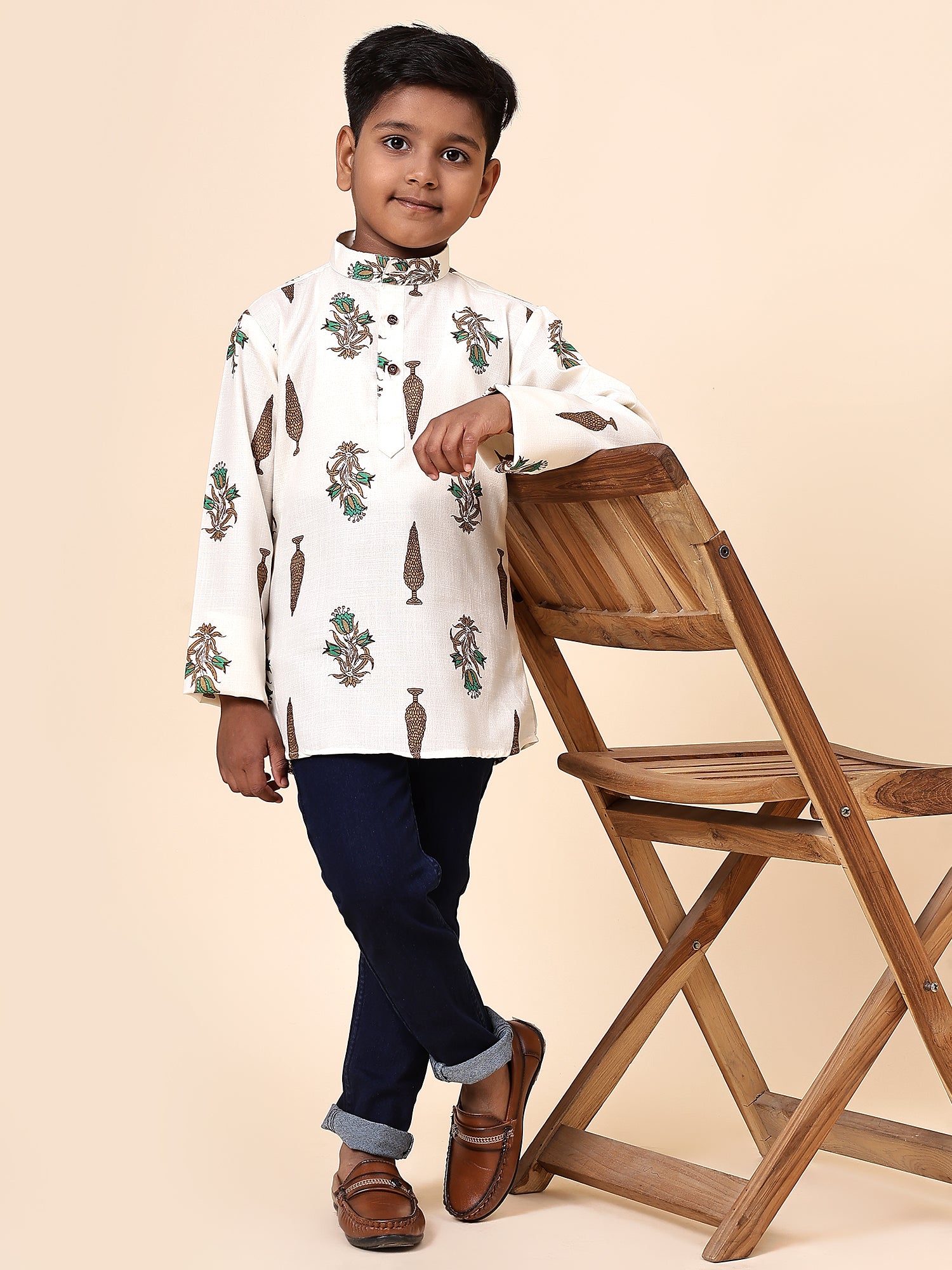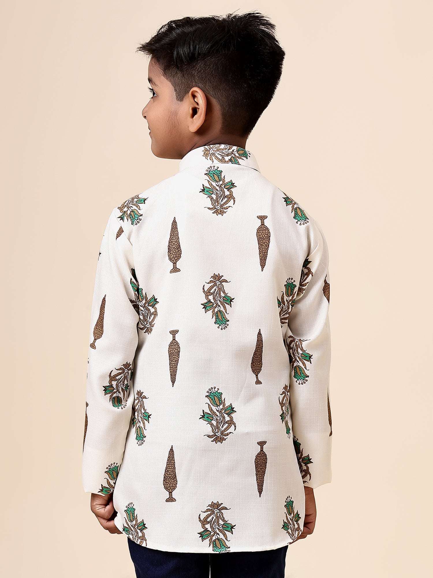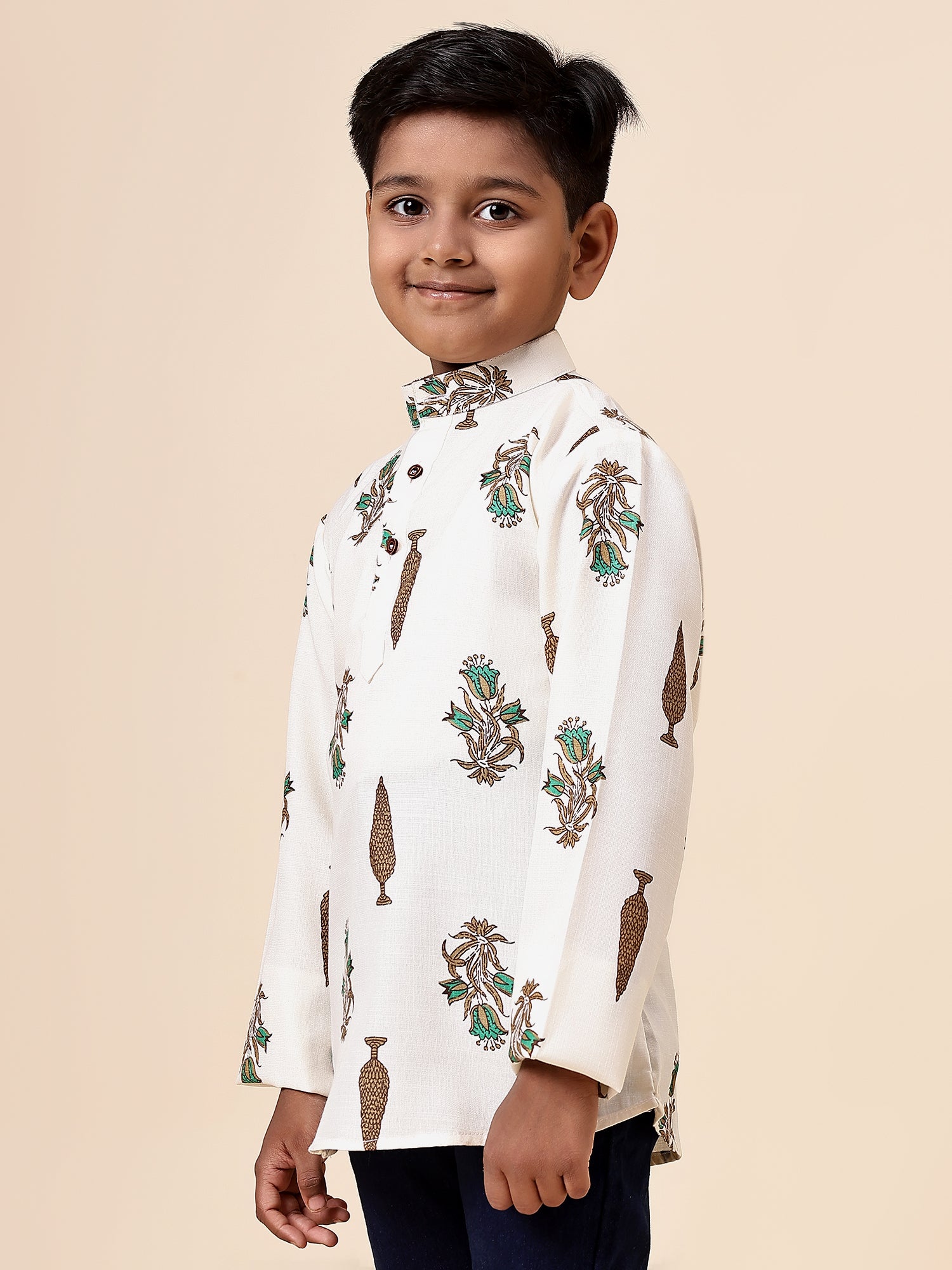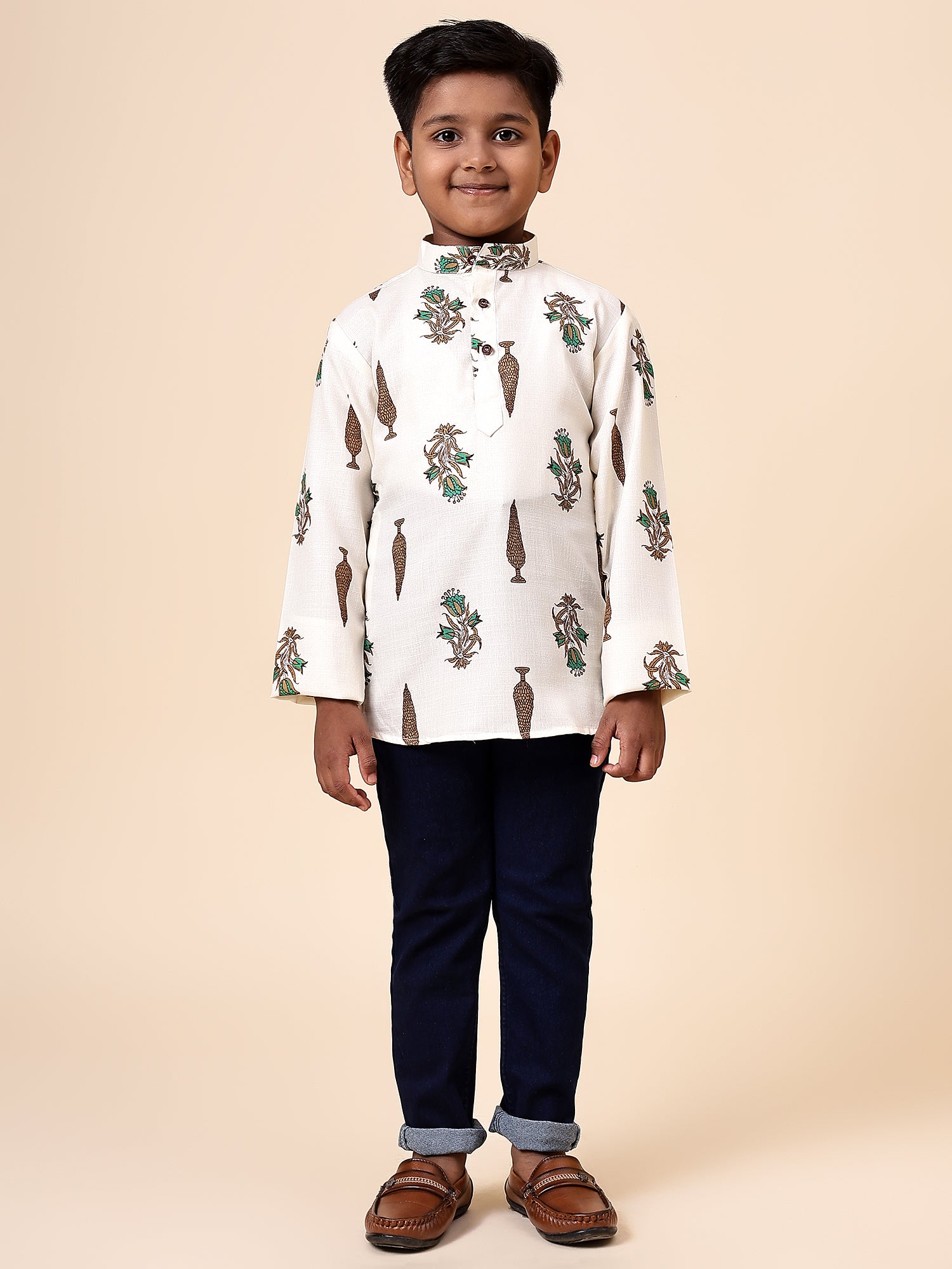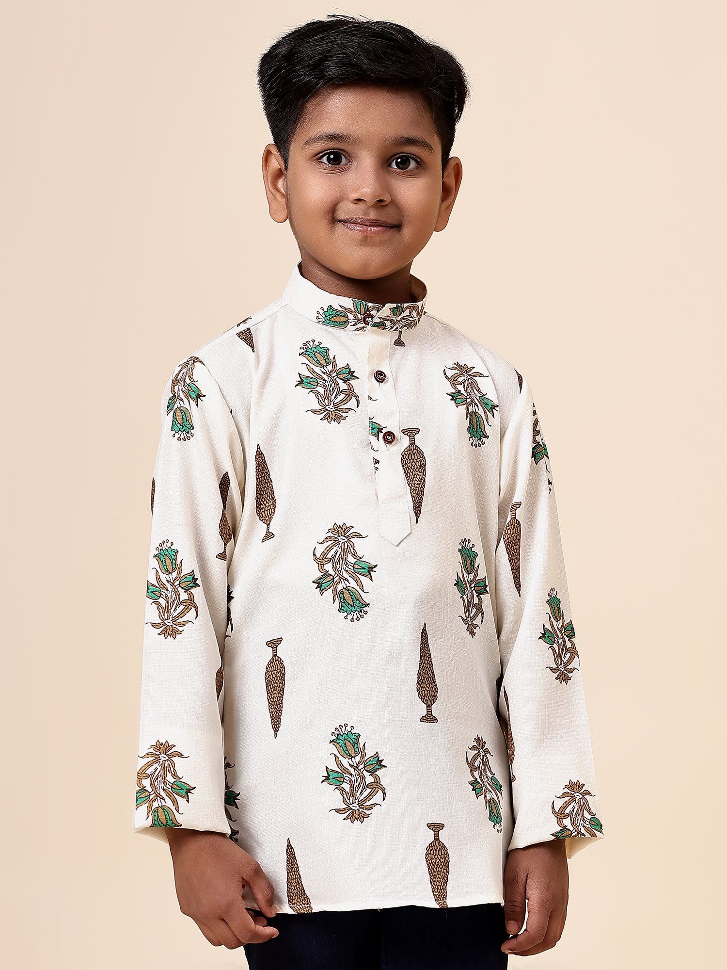 Karnam Junior - Boys Cream Foliage Cotton Short Kurta