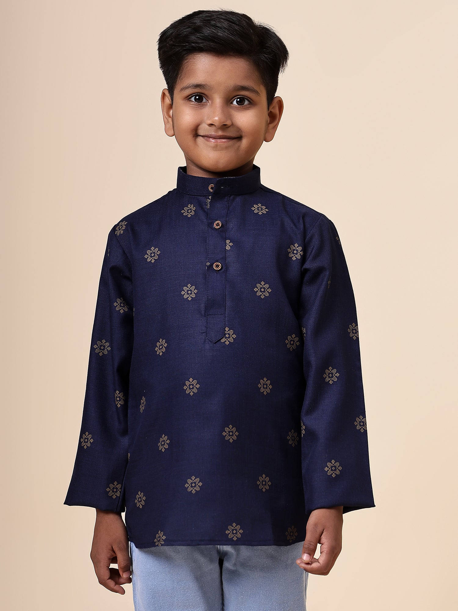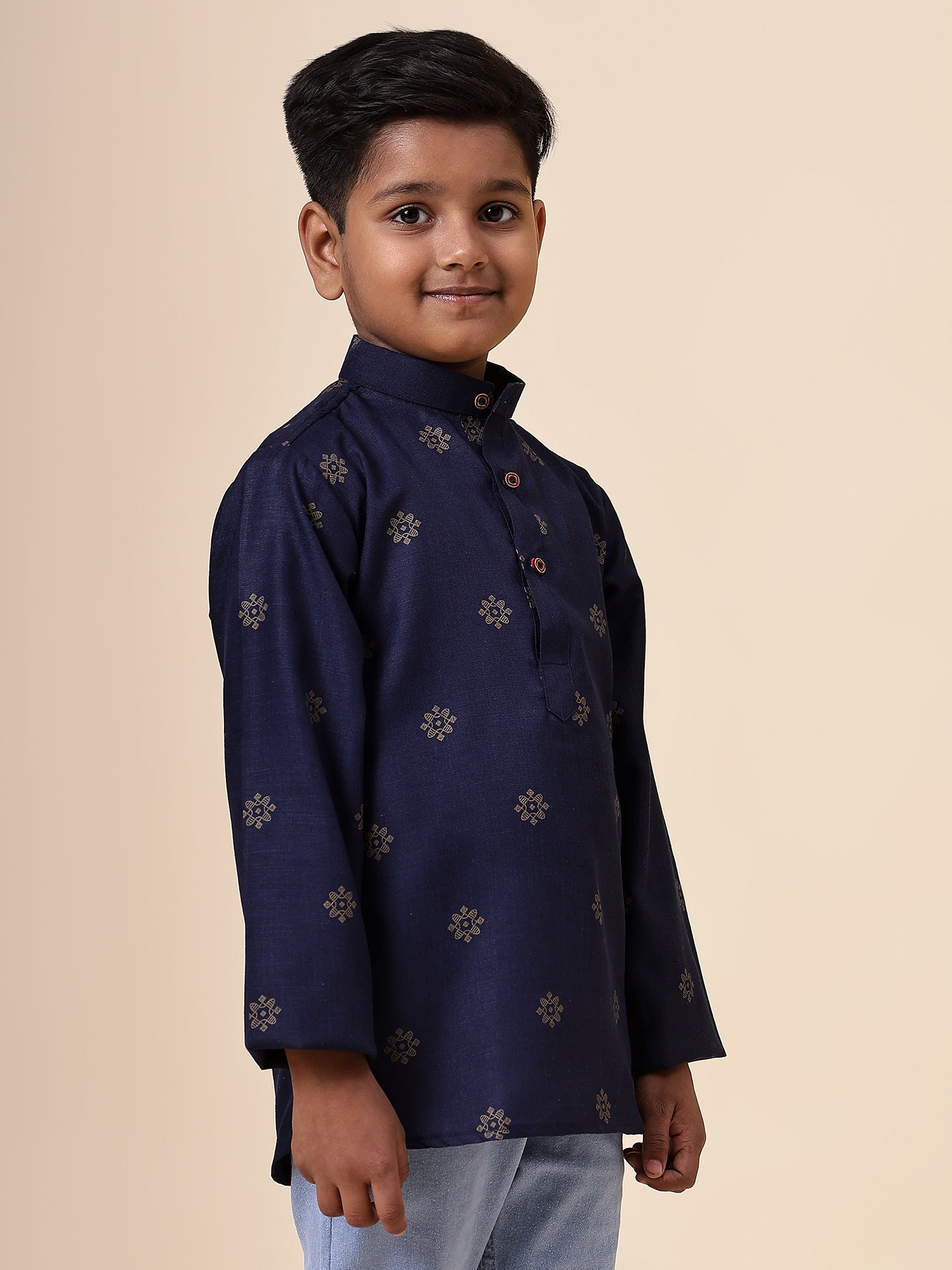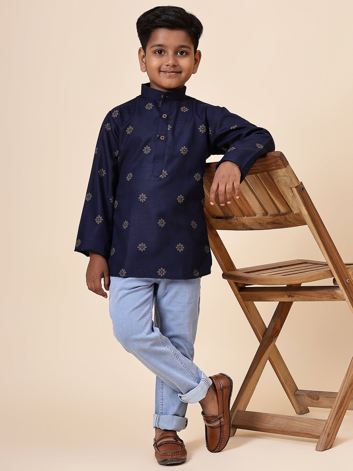 Karnam Junior - Boys Navy Blue and Gold Cotton Short Kurta