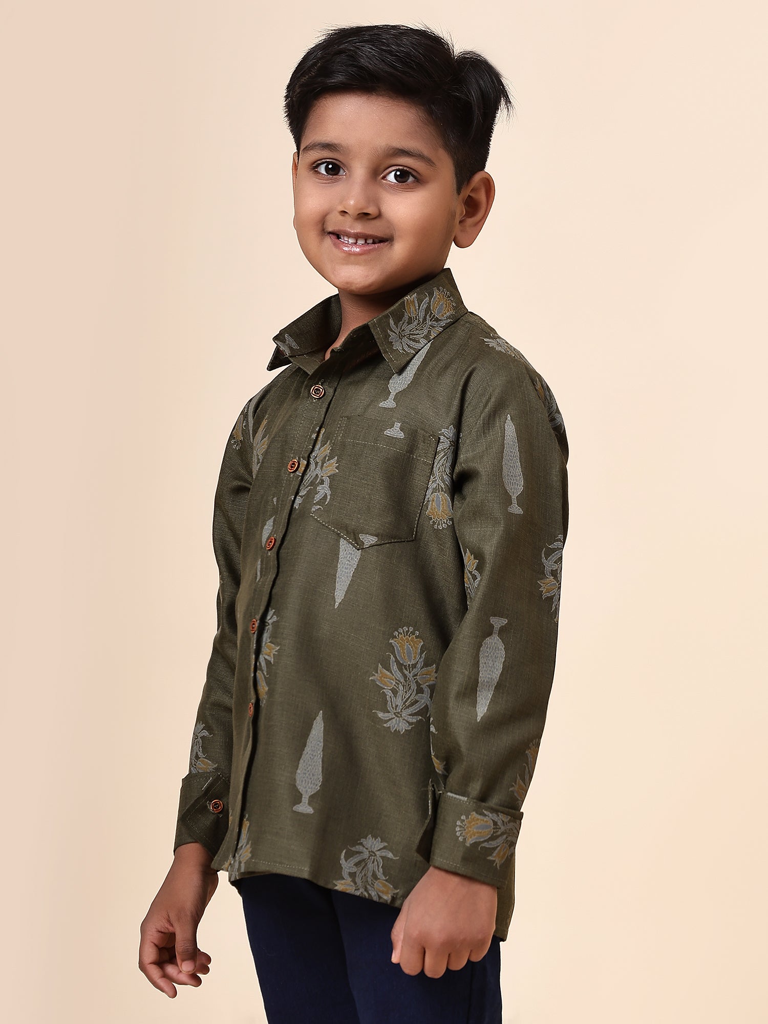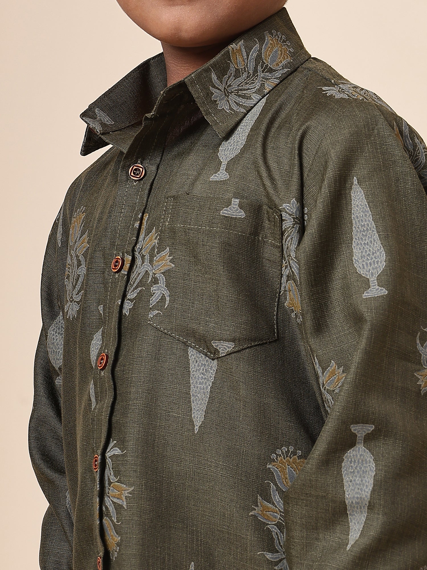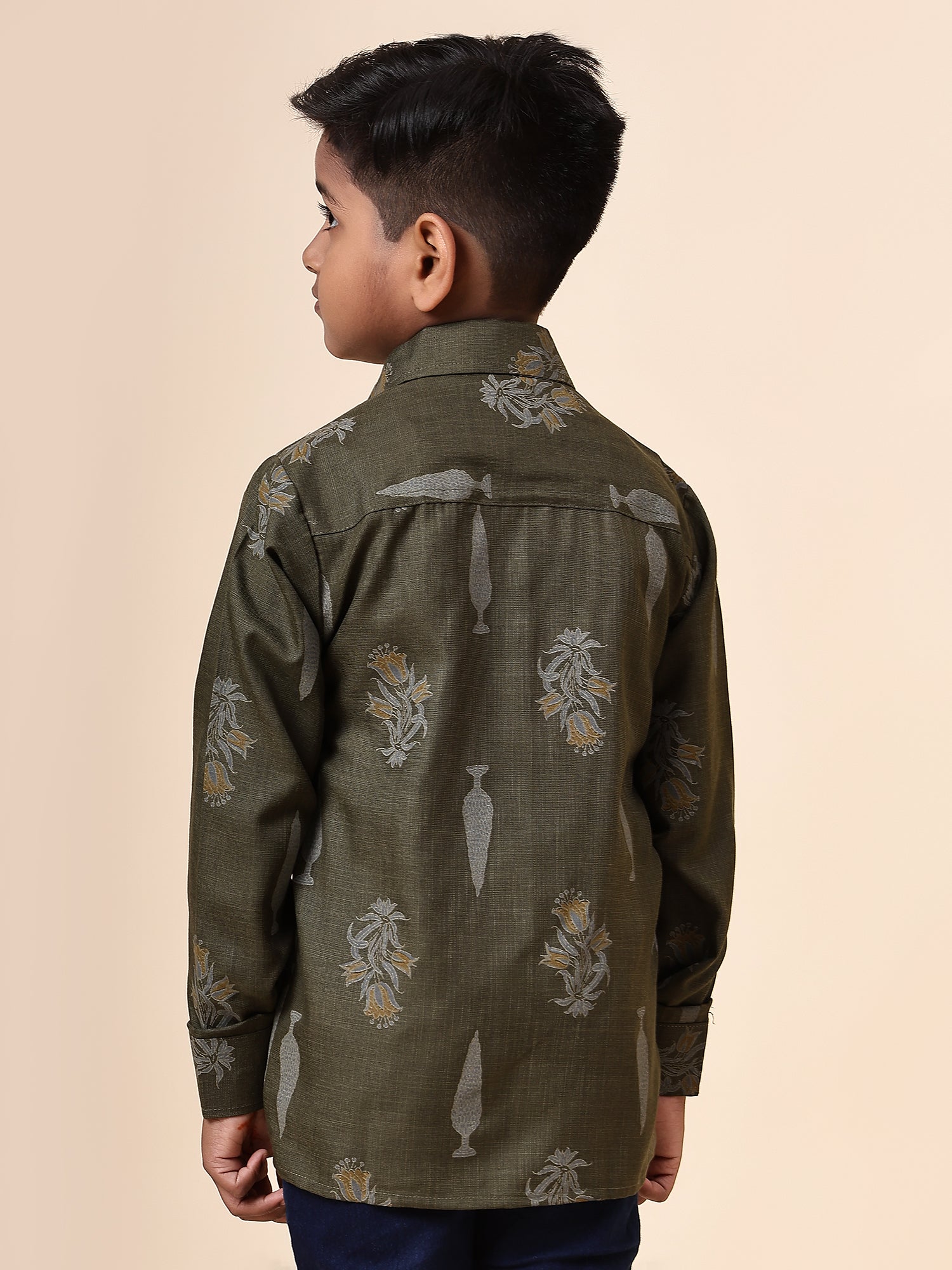 Karnam Junior - Boys Olive Green Foliage Printed Cotton Shirt