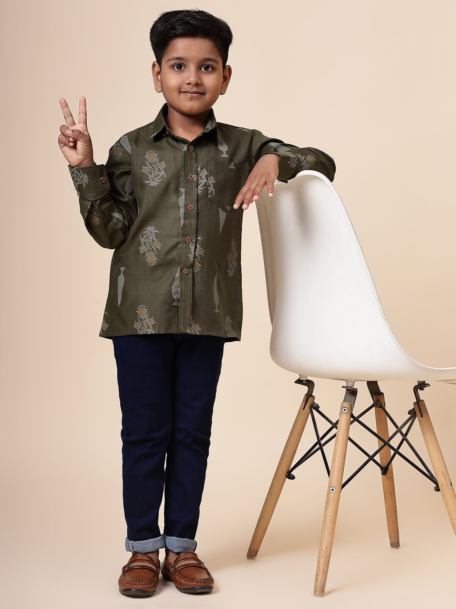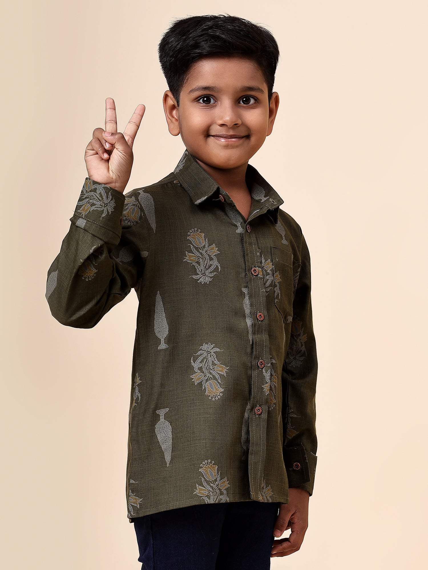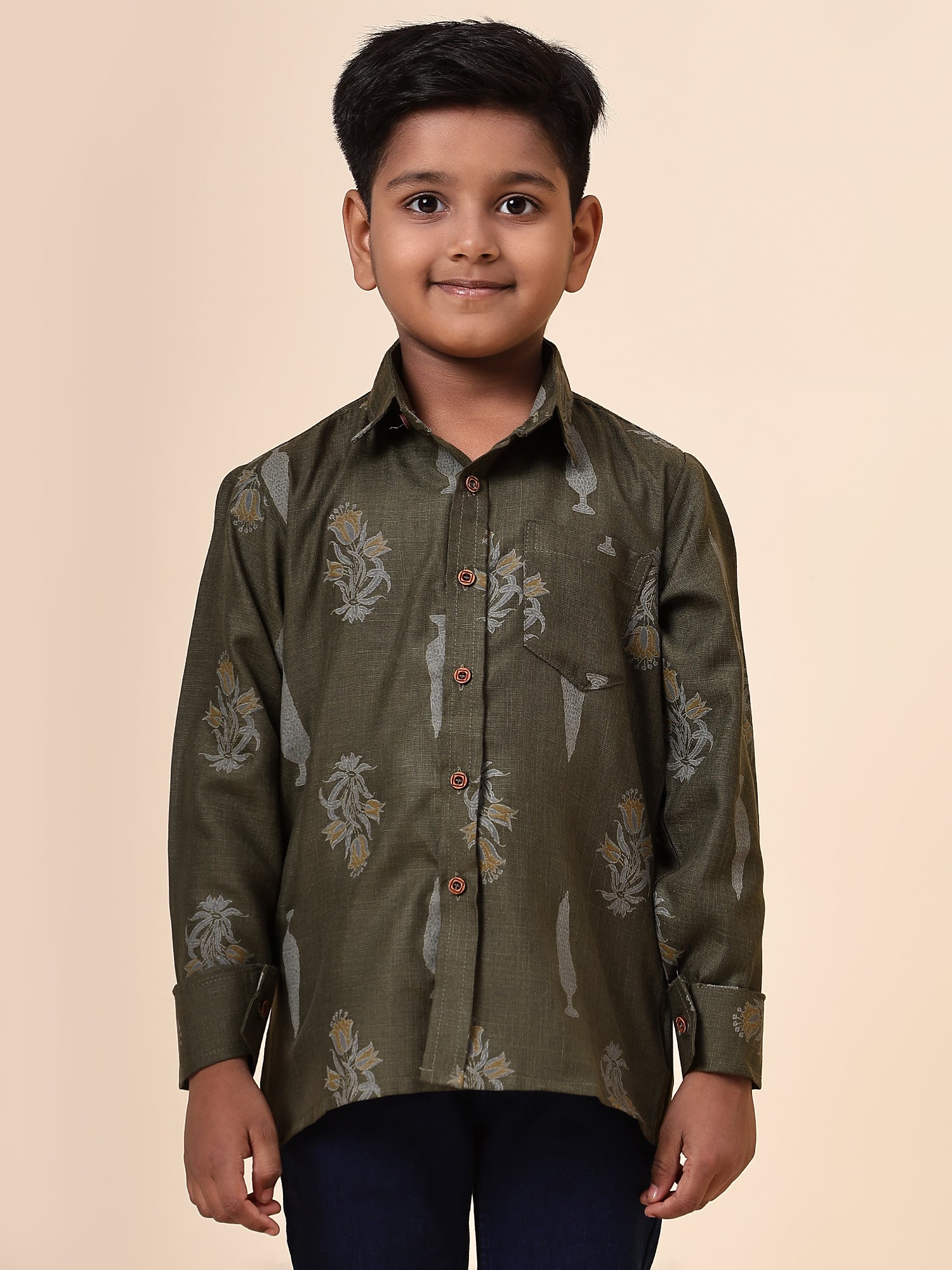 Karnam Junior - Boys Olive Green Foliage Printed Cotton Shirt