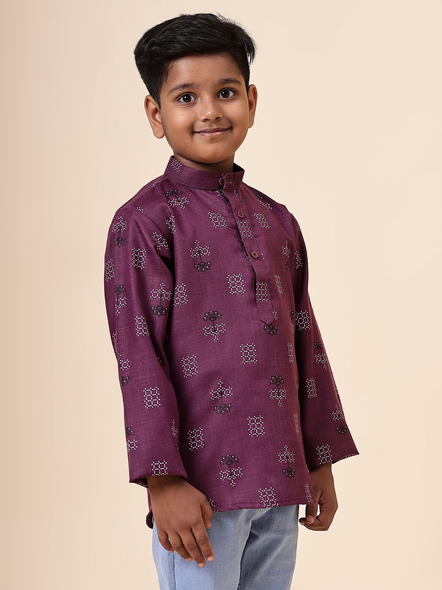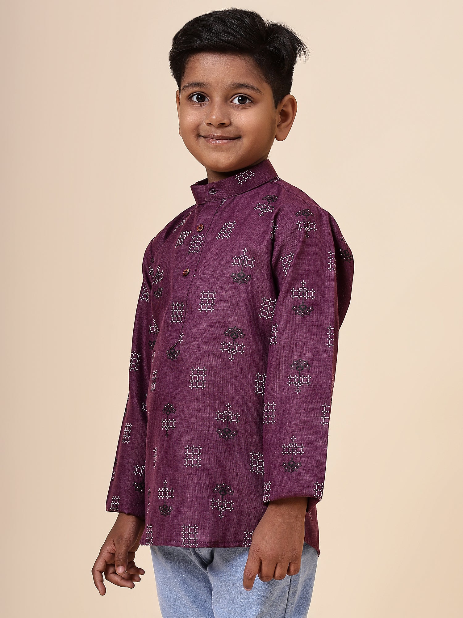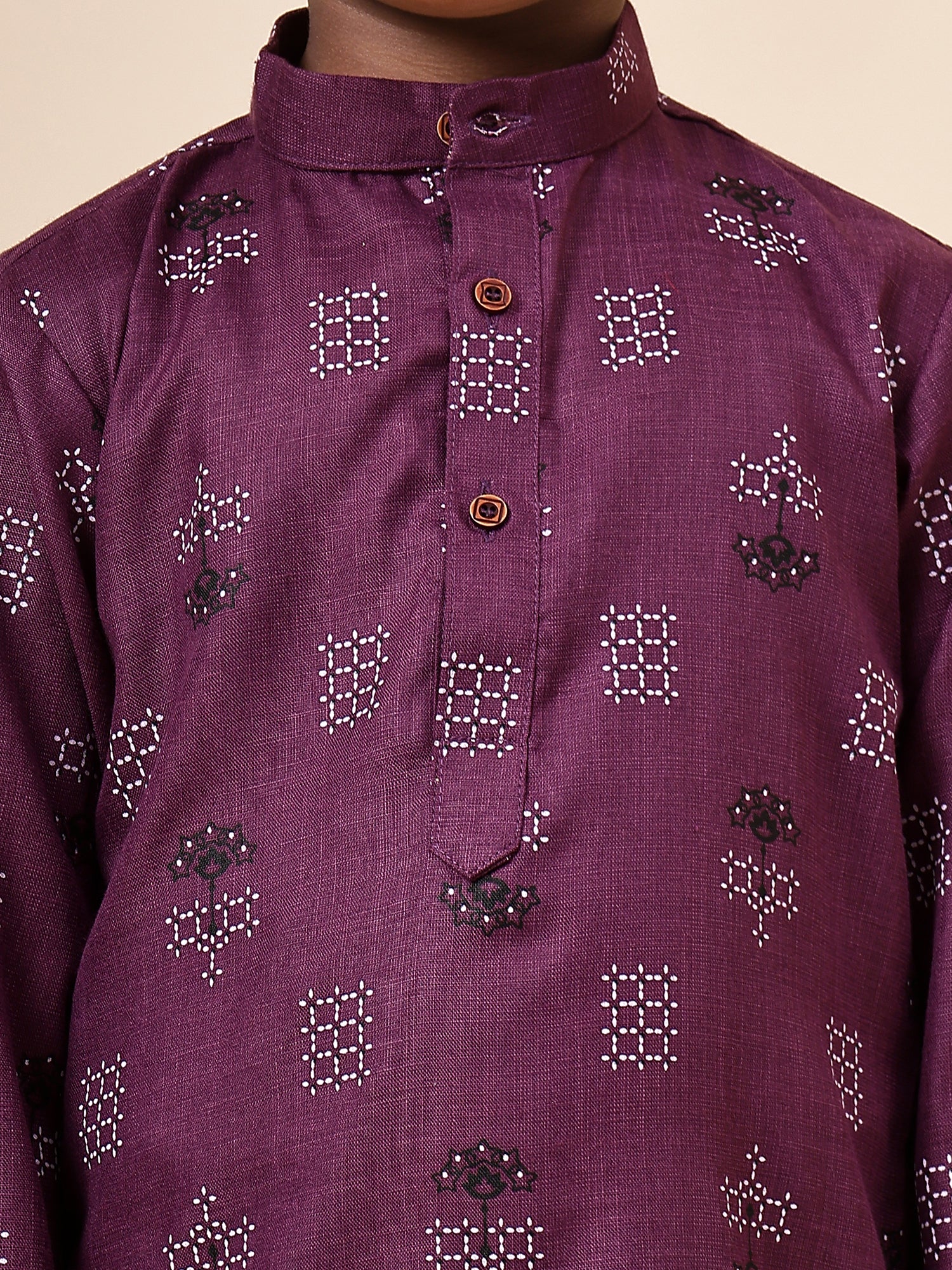 Karnam Junior - Boys Purple Square Printed Cotton Short Kurta