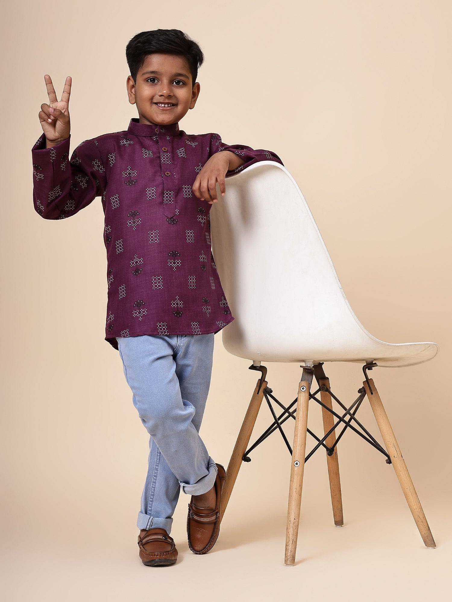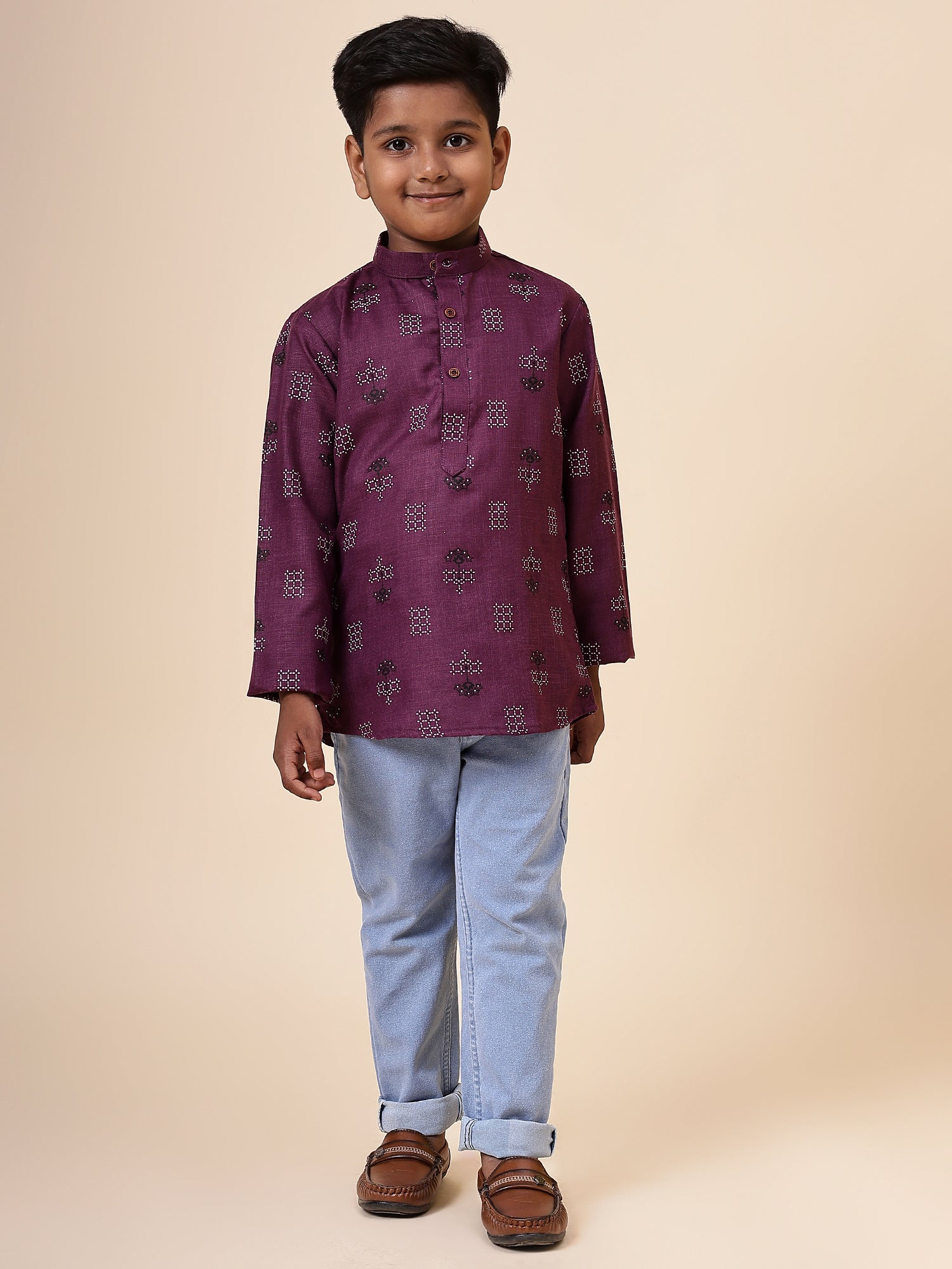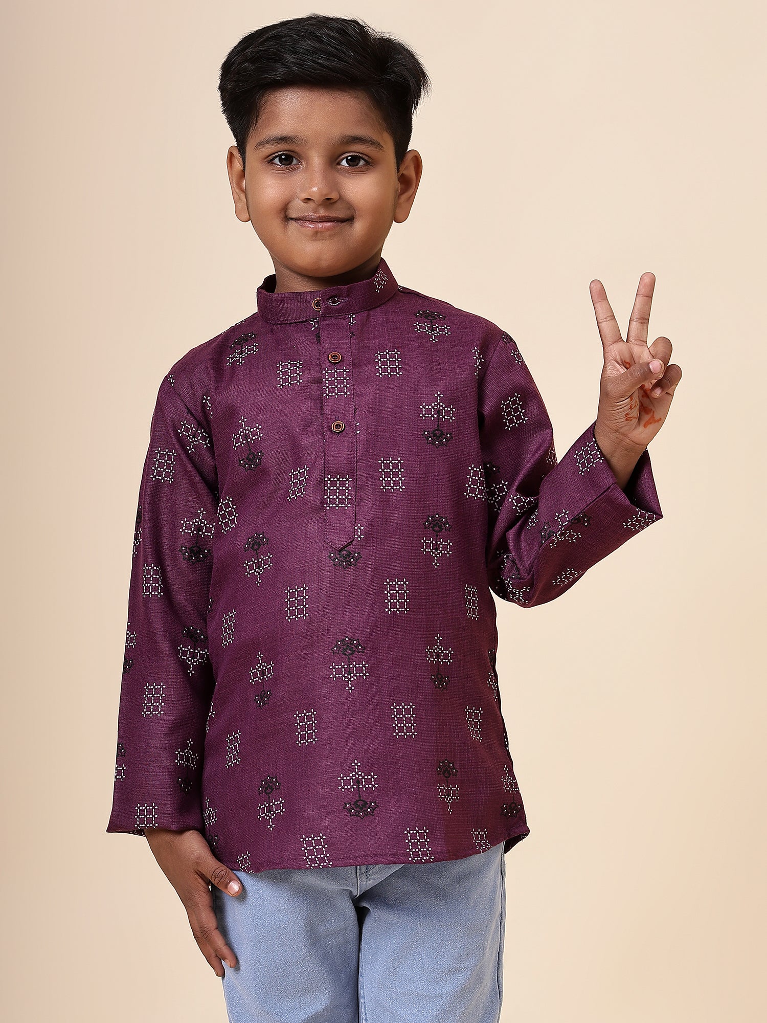 Karnam Junior - Boys Purple Square Printed Cotton Short Kurta